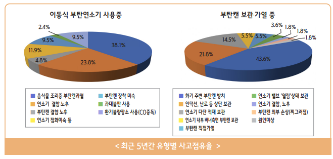 사용 중 사고 유형으로는 휴대용 가스렌지 사용 중 폭발이 가장 많으며, 난방기 부탄가스 사용 중 가스 누출로 인한 중독, 토치에 연결하여 사용 중 폭발 및 화재 발생이 있습니다.
