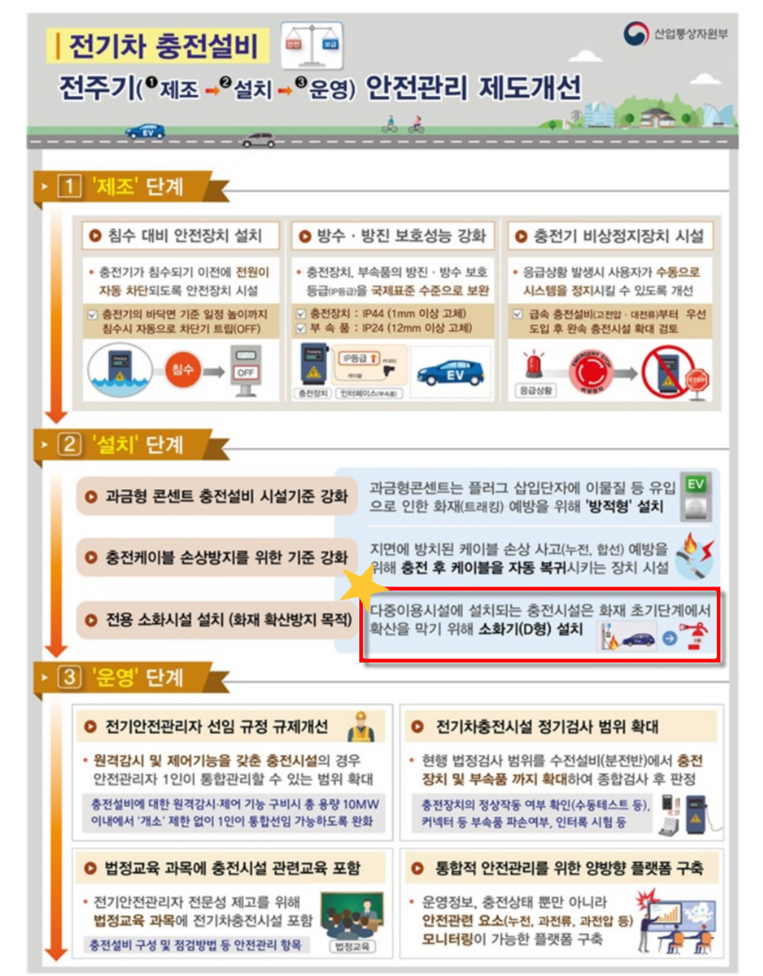 최근 전기차 충전소에서 화재가 많이 발생하고 있는데 D급소화기로 초기화재를 진압하여 대형화재를 예방해야 합니다.