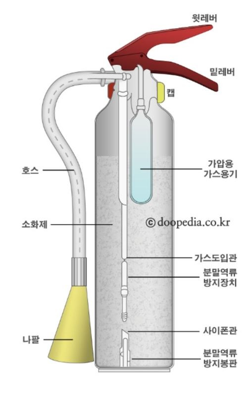 ※ 우리나라에 존재하는 가압식 소화기는 노후된 소화기이기에, 용기가 폭발할 가능성이 큽니다. 가압식 소화기를 발견한다면 가까운 소방서에 방문하여 가져다주어야 합니다.